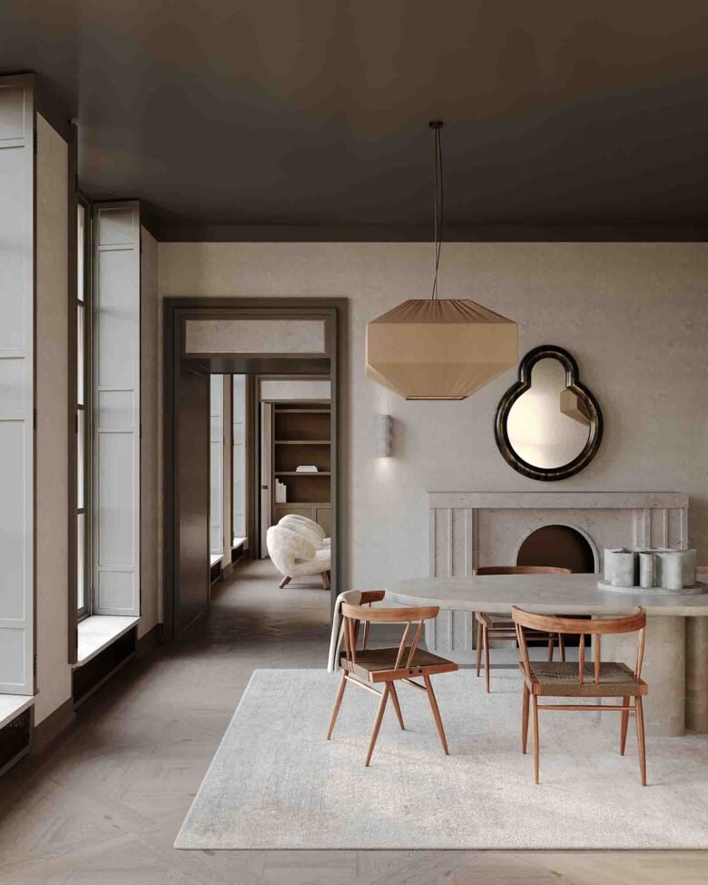 The south-facing aspect affords unimpeded views of the Alps. Measuring 42 square metres, with traditional Alpine woods, warm fireplaces, and natural-stone touches.